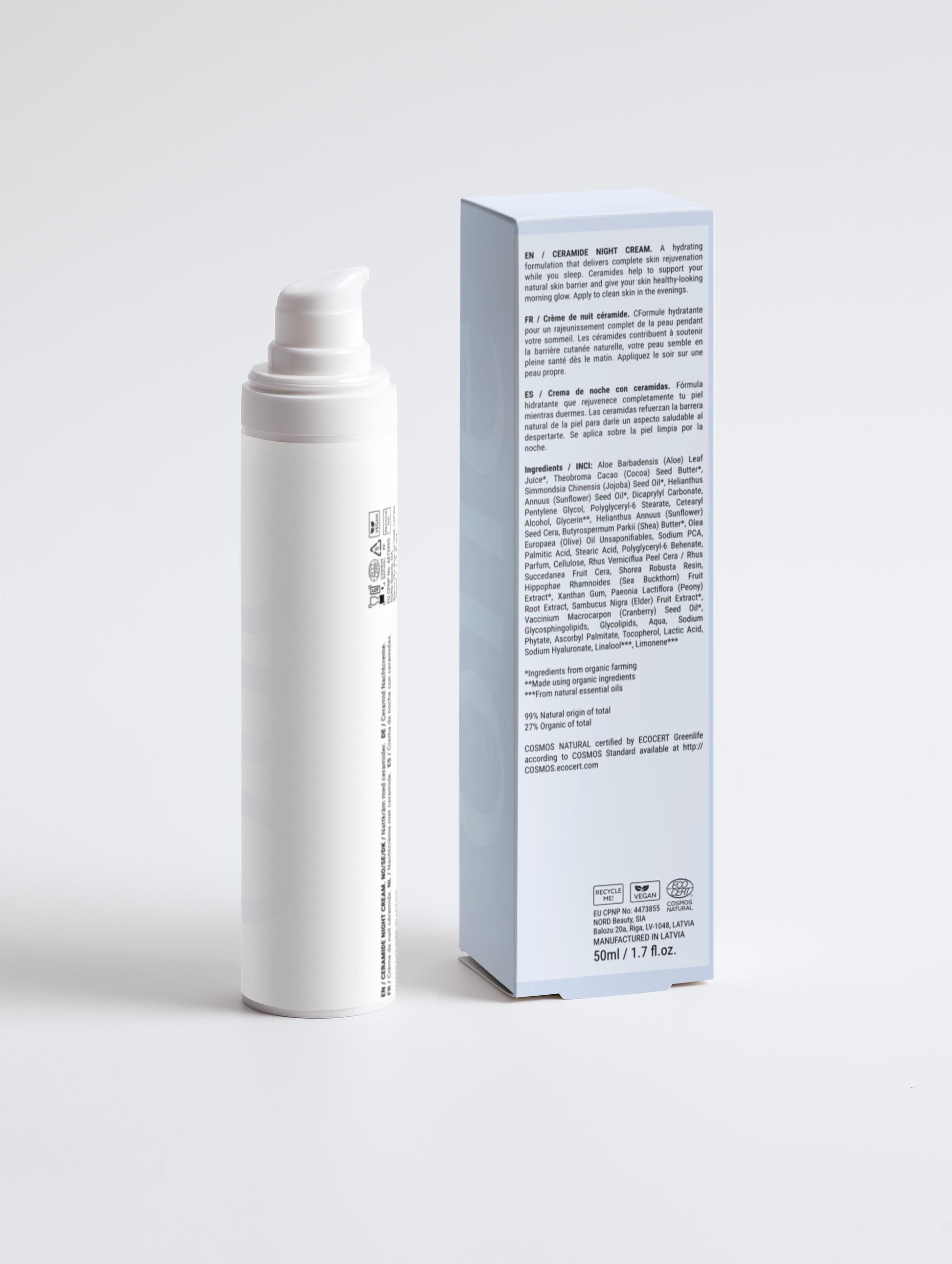 Night creams play a crucial role in supporting the skin's natural rejuvenation process during the night. This is why they are one of the most popular product categories and will be a great addition to any skincare product line. Product description: The Ceramide Hydrating Night Cream is thoughtfully formulated with ingredients that work their magic overnight, promoting skin renewal and a radiant glow. Hydrating formulation glides effortlessly onto your skin and delivers complete skin rejuvenation while you sleep. Ceramides help to support natural skin barrier and give your skin healthy-looking skin in the morning. Apply to clean skin in the evenings. Combine with: Botox-Like Peptide Serum or Nourishing Facial Oil and Smoothing Eye Cream for a complete night time routine. In addition, use the Moisturising Day Cream during your morning skincare routine. Ceramides, Aloe Juice, Jojoba Oil, Sunflower Oil, Cocoa Butter, Shea Butter, Sodium PCA, Hyaluronic Acid